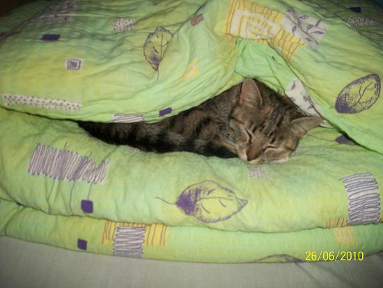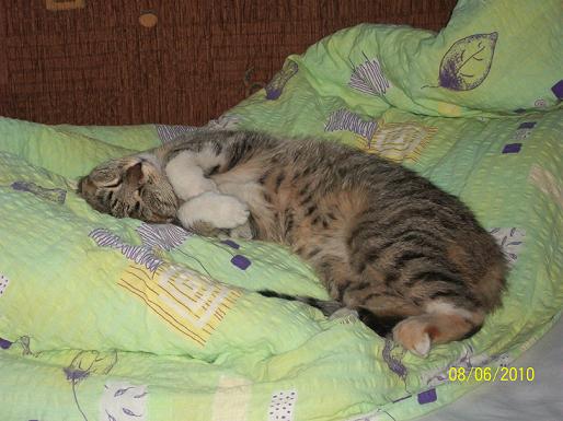 Majorka^^, on całą noc buszuje na polu a rano o pół 5 miauczy pod oknami, żeby go wpuścić :P dobrze, że nigdy tego nie słyszę :P jak go już puścimy to on nieprzytomny leci do miski z jedzeniem, zasypia się mu nad nią :P wyłazi na górę i idzie do pokoju brata i zasypia i śpi do wieczora z kilkoma przerwami na jedzenie ;)