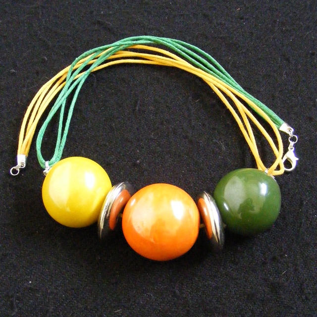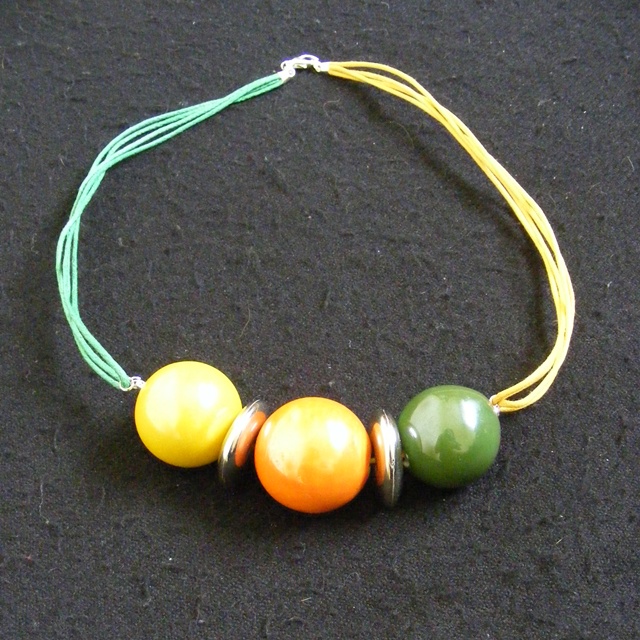 Naszyjnik w stalowo -srebrnym kolorze,bardzo elegancki ,zaś ten w odcieniu pomarańczu i żółci,niezwykle letni i sportowy.Obydwa mi się podobają.